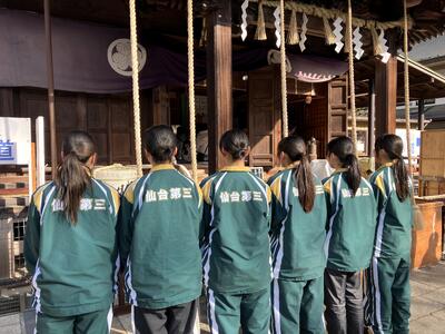 仙台三高女子バスケットボール部です。新年恒例の「お参りRUN」を行いました。例年は凍えるような寒さの中を走りますが、今年は暖かな日差しに恵まれ、絶好のランニング日和となりました。ちなみに、例年通り顧問も生徒と一緒に全力で完走しています!参拝では新年のさらなる飛躍を祈願し、おみくじで今年の「バスケ運」を占うなど、和やかなスタートを切ることができました。