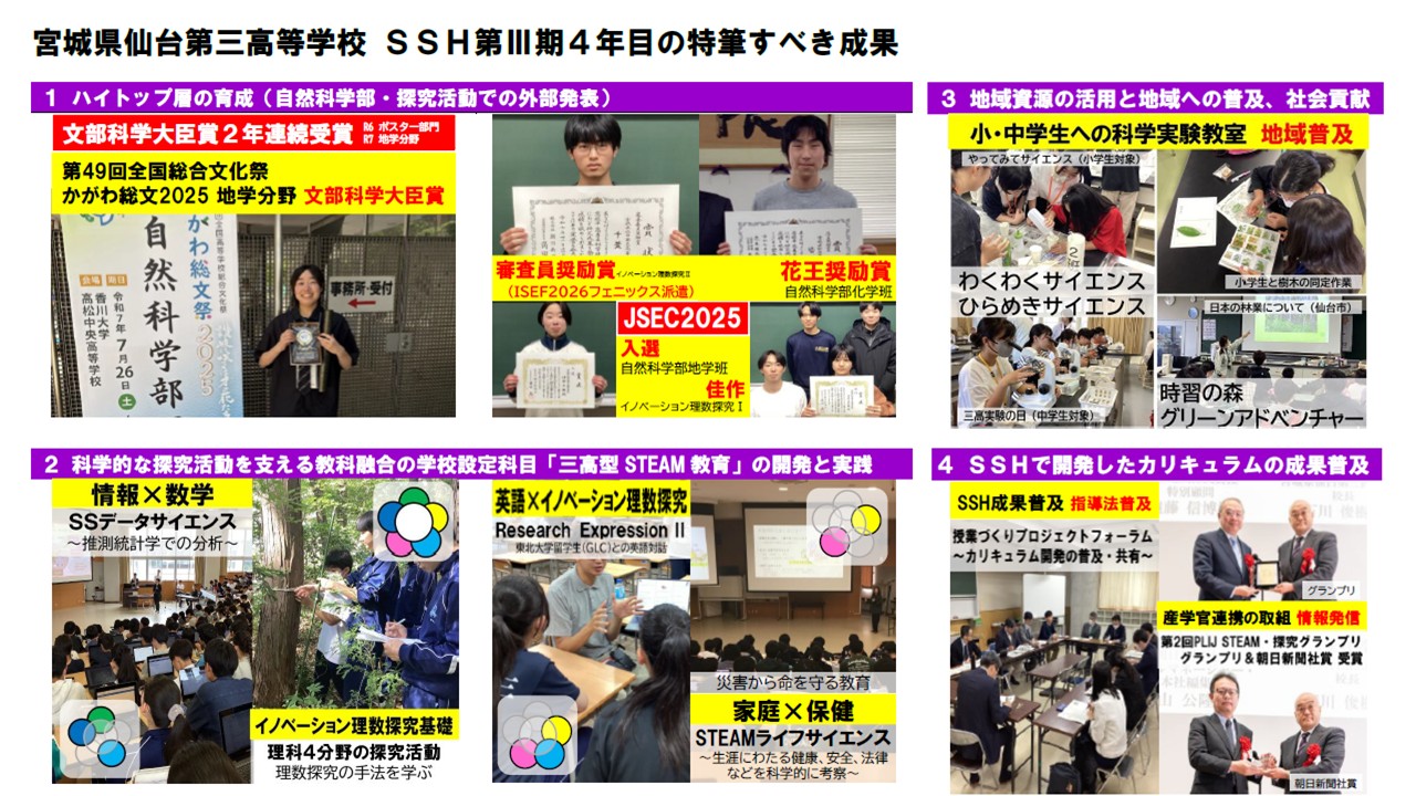 令和8年1月26日 東京大学駒場キャンパスⅡ東京大学生産技術研究所で第2回PLIJ STEAM・探究グランプリの授賞式が行われました。日本全国で実施されている産学官公教が連携した取組の中からグランプリ11団体と特別賞2団体が選出され、仙台三高はグランプリを受賞しました。さらに、グランプリ11団体の中から新設された「朝日新聞社賞」にも選ばれ、ダブル受賞でした。仙台三高で毎日実施されている授業と課外活動の取組が企業、大学、地域団体など外部機関の協力で実施され、生徒の探究がより深まっていることが高く評価されました。今回のグランプリ受賞は、多くの協力機関に仙台三高のSSH事業やリーディングDXスクール、ユネスコスクールの活動が支えられている証です。引き続きのご支援をよろしくお願いいたします。仙台三高は、外部機関と連携しながら、生徒に本物を体験させられるように挑戦を続けていきます。